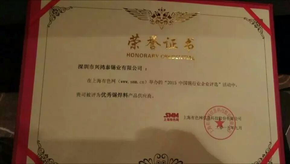 “2015(第五屆)中國錫產(chǎn)業(yè)鏈交易峰會&錫企業(yè)頒獎”于2015年9月11-12日?在中國無錫太湖皇冠假日酒店召開。深圳市興鴻泰錫業(yè)有限公司在上海有色網(wǎng)(www.SMM.cn)舉辦的“2015年中國錫行業(yè)企業(yè)評選”活動中,被評為“優(yōu)秀焊錫料產(chǎn)品供應(yīng)商”的榮譽稱號。